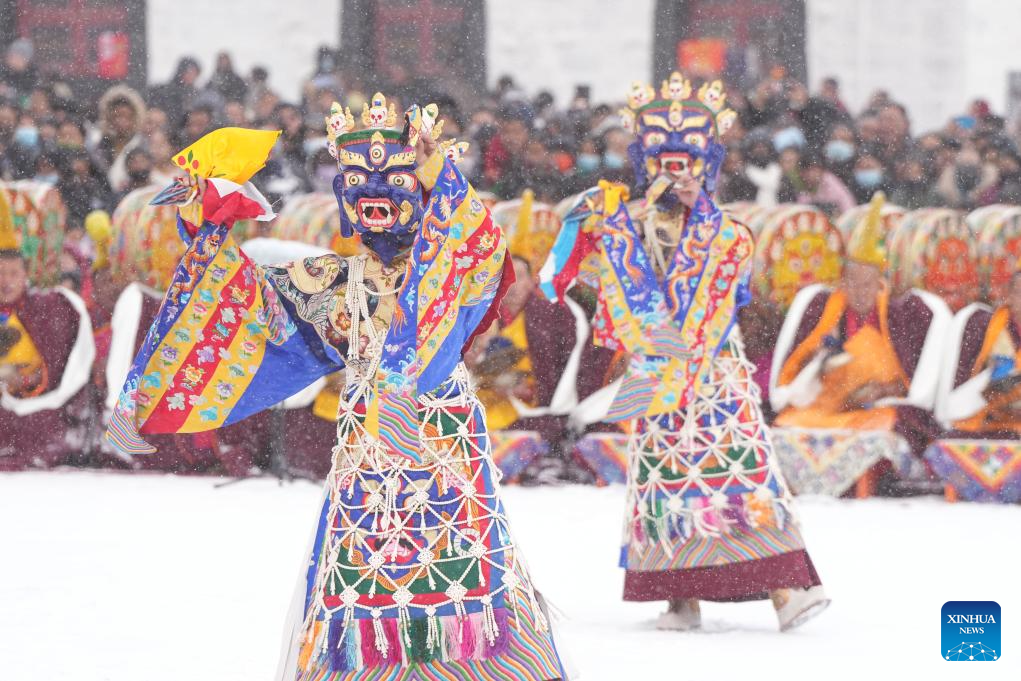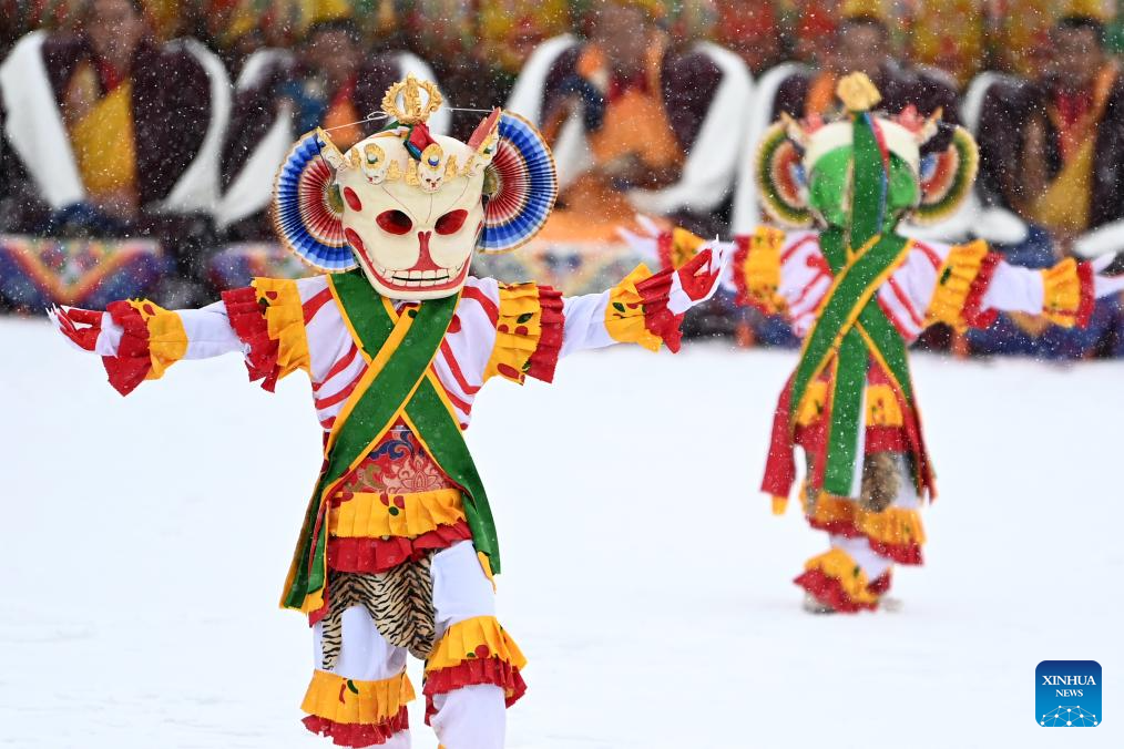 Masked lamas perform exorcism dance at a square in the Labrang Monastery in Xiahe County, northwest China's Gansu Province, Feb. 23, 2024. The Labrang Monastery held the annual event of exorcism dance to pray for good luck in the new year. Built in 1709, Labrang Monastery is one of the six great monasteries of the Gelug Sect of Tibetan Buddhism. (Xinhua/Fang Xin)