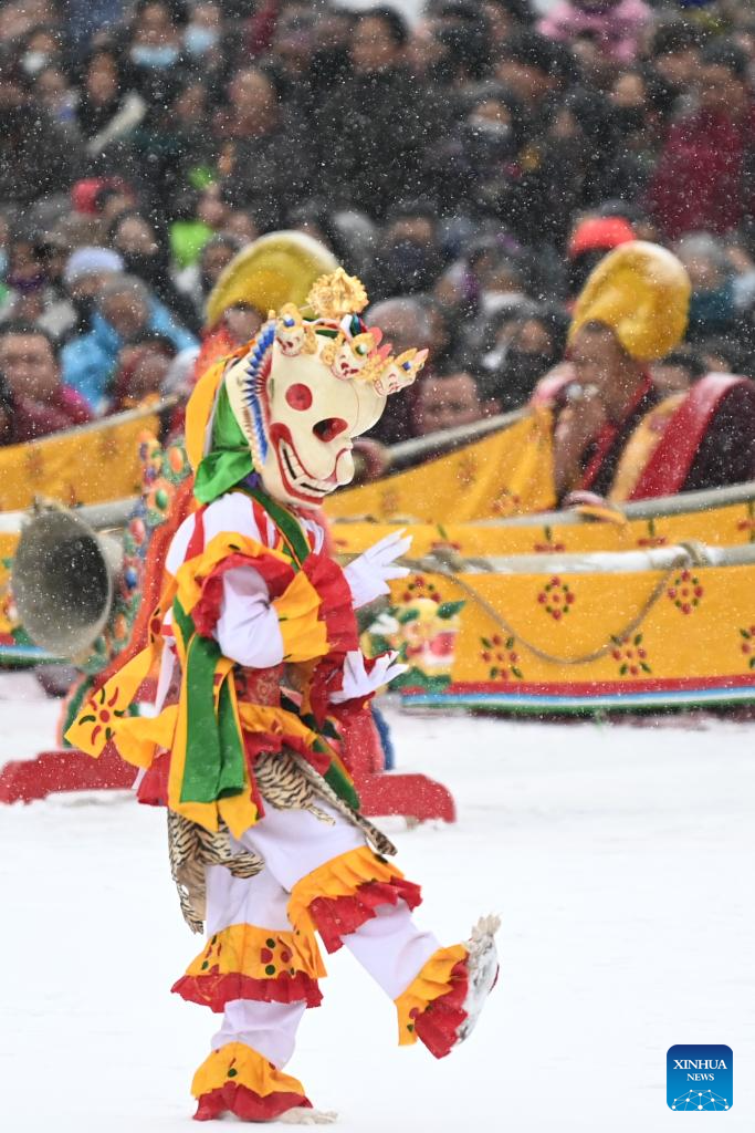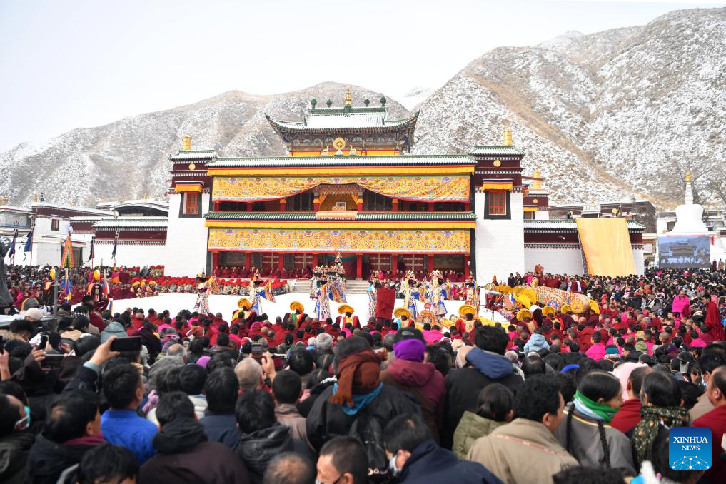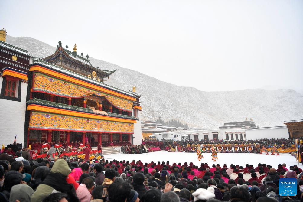 People watch exorcism dance performed by masked lamas at the Labrang Monastery in Xiahe County, northwest China's Gansu Province, Feb. 23, 2024. The Labrang Monastery held the annual event of exorcism dance to pray for good luck in the new year. Built in 1709, Labrang Monastery is one of the six great monasteries of the Gelug Sect of Tibetan Buddhism. (Xinhua/Chen Bin)