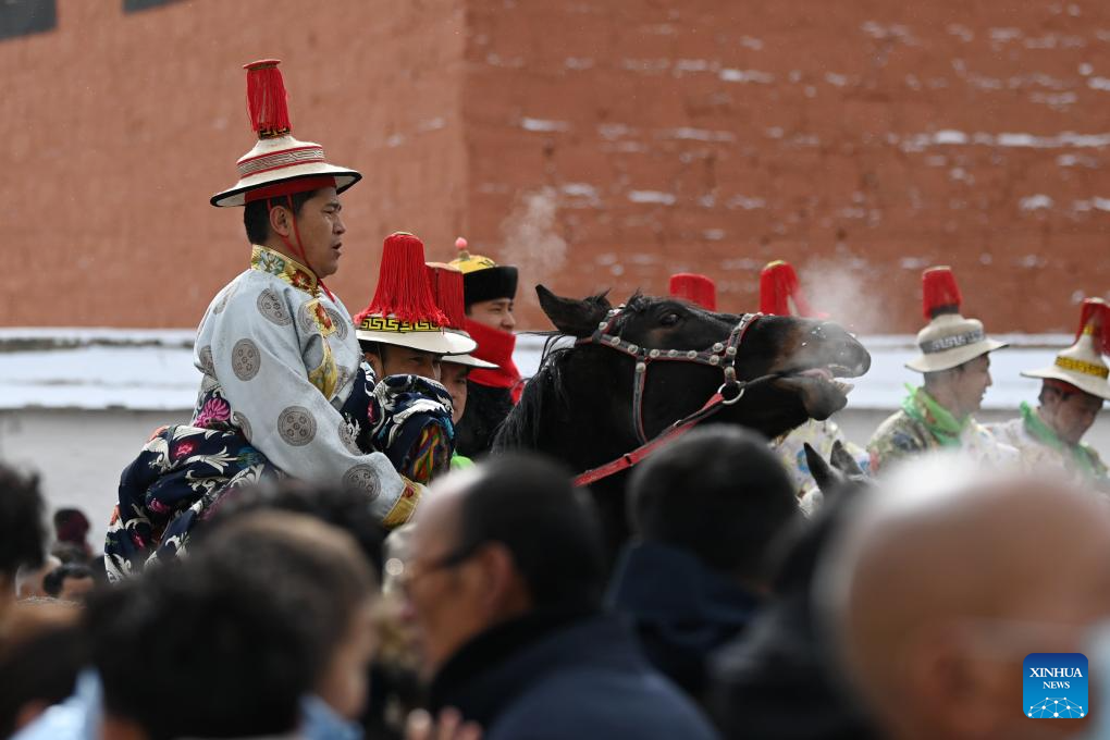 People take part in a parade during the exorcism dance performance at the Labrang Monastery in Xiahe County, northwest China's Gansu Province, Feb. 23, 2024. The Labrang Monastery held the annual event of exorcism dance to pray for good luck in the new year. Built in 1709, Labrang Monastery is one of the six great monasteries of the Gelug Sect of Tibetan Buddhism. (Xinhua/Chen Bin)