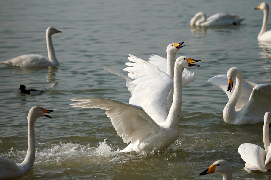 White swans are seen on Pinglu Yellow River Wetland in Pinglu County of Yuncheng, north China's Shanxi Province, Jan. 9, 2024. (Xinhua/Zhan Yan)