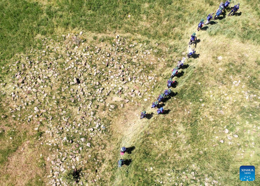 This aerial drone photo taken on March 7, 2024 shows people participating in the Moshoeshoe Walk 2024 in Menkhoaneng, Lesotho. People participated in the event to commemorate the 200th anniversary of the founding of the Basotho nation, which became the Kingdom of Lesotho in 1966 after gaining independence from the United Kingdom. (Xinhua/Zhang Yudong)