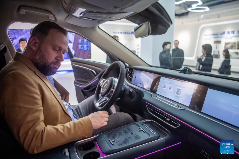 Dominik Bartz, head of Hub International, Duisburg, experiences an intelligent vehicle at an intelligent and connected vehicles testing and demonstration area in Wuhan, capital of central China's Hubei Province, March 12, 2024. (Xinhua/Wu Zhizun)