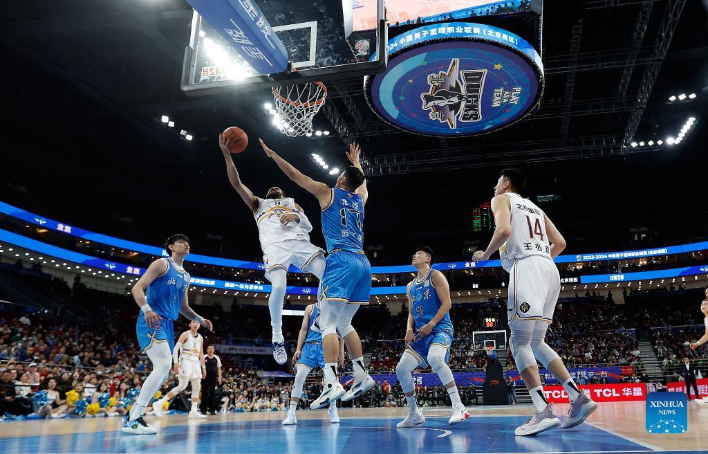 Grant Riller (top L) of Beijing Royal Fighters goes for the basket during the 44th round match between Beijing Ducks and Beijing Royal Fighters at the 2023-2024 Chinese Basketball Association (CBA) league in Beijing, China, March 17, 2024. (Xinhua/Wang Lili)