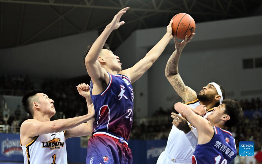 Shi Deshuai (2nd L) of Tianjin Pioneers blocks Eric Moreland (2nd R) of Liaoning Flying Leopards during the 44th round match between Tianjin Pioneers and Liaoning Flying Leopards at the 2023-2024 season of the Chinese Basketball Association (CBA) league in north China's Tianjin, March 17, 2024. (Xinhua/Sun Fanyue)