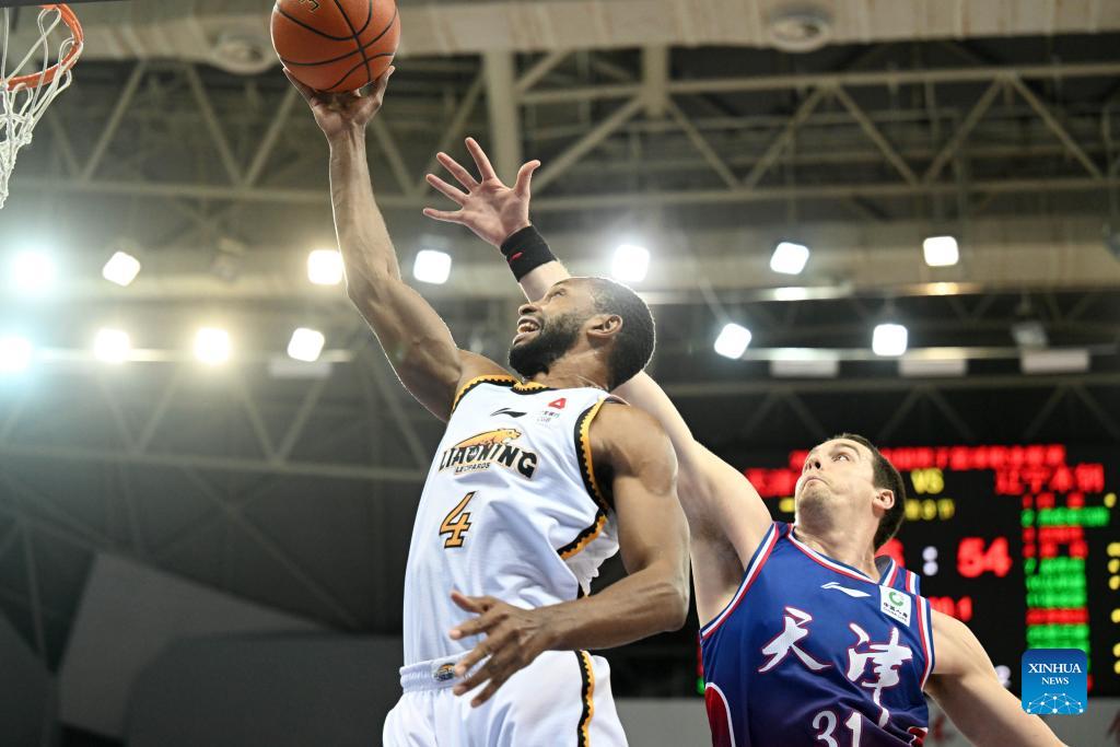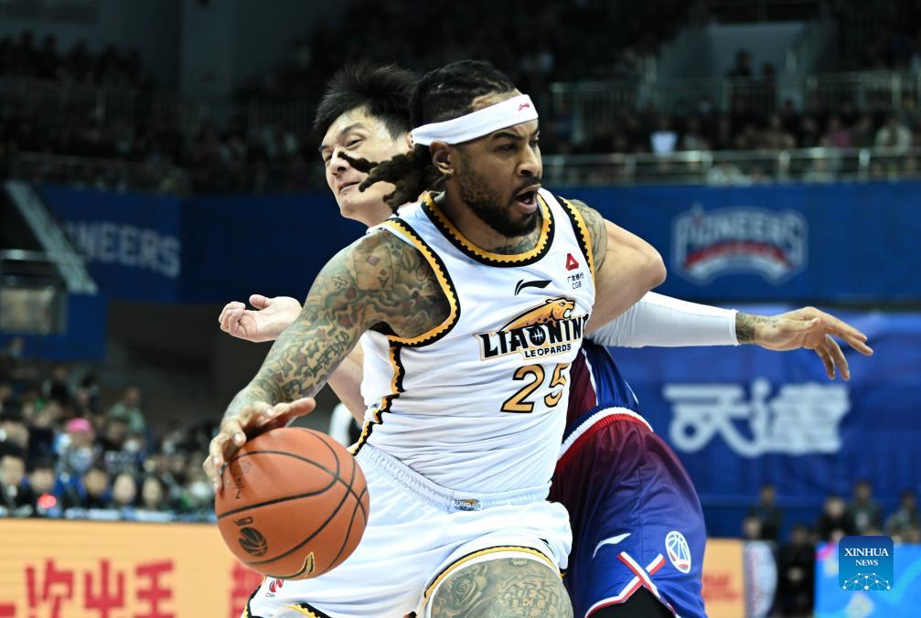Eric Moreland (front) of Liaoning Flying Leopards competes during the 44th round match between Tianjin Pioneers and Liaoning Flying Leopards at the 2023-2024 season of the Chinese Basketball Association (CBA) league in north China's Tianjin, March 17, 2024. (Xinhua/Sun Fanyue)