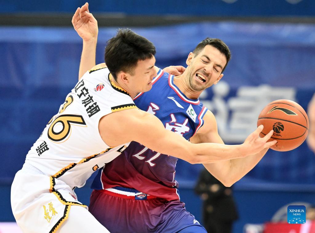 Eric Moreland (front L) of Liaoning Flying Leopards vies with David James (front R) of Tianjin Pioneers during the 44th round match between Tianjin Pioneers and Liaoning Flying Leopards at the 2023-2024 season of the Chinese Basketball Association (CBA) league in north China's Tianjin, March 17, 2024. (Xinhua/Sun Fanyue)
