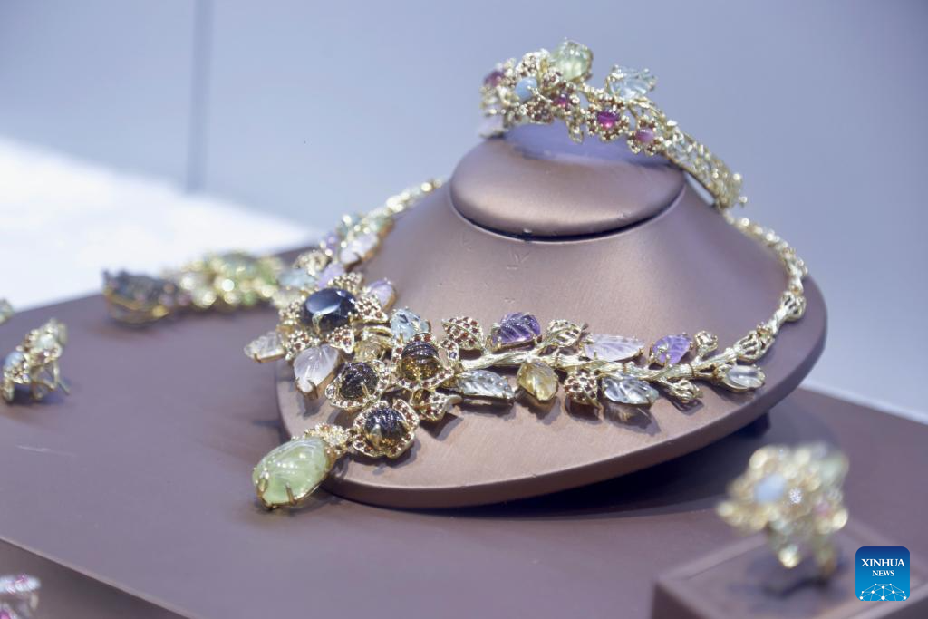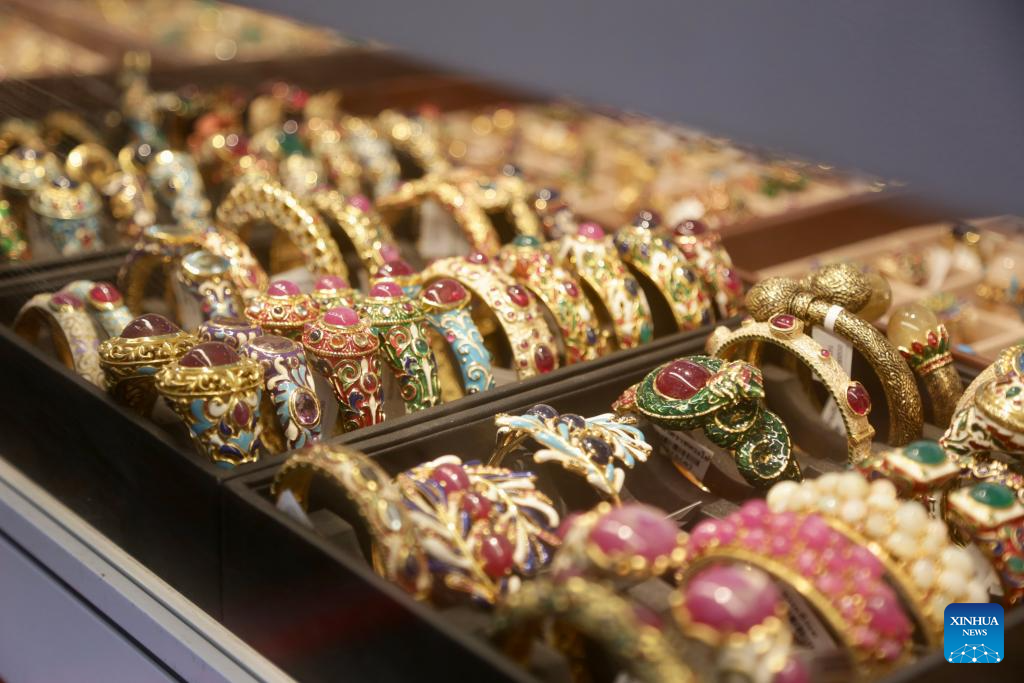 Jewelry is on display during the 15th edition of Cambodia International Gems and Jewelry Fair in Phnom Penh, Cambodia on March 21, 2024. The 15th edition of Cambodia International Gems and Jewelry Fair kicked off here on Thursday, aiming to boost trade of precious stones and jewelry, a commerce official said. (Photo by Phearum/Xinhua)