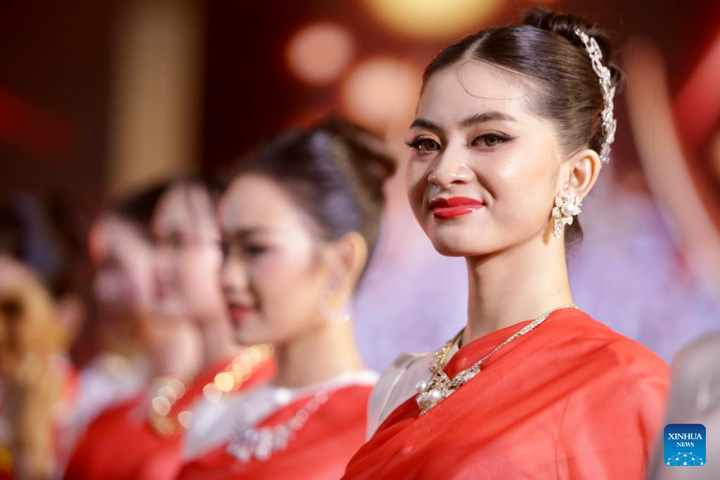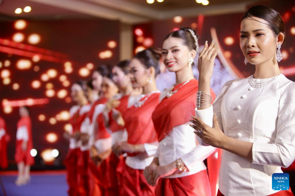 Models present gems and jewelry during the 15th edition of Cambodia International Gems and Jewelry Fair in Phnom Penh, Cambodia on March 21, 2024. The 15th edition of Cambodia International Gems and Jewelry Fair kicked off here on Thursday, aiming to boost trade of precious stones and jewelry, a commerce official said. (Photo by Phearum/Xinhua)