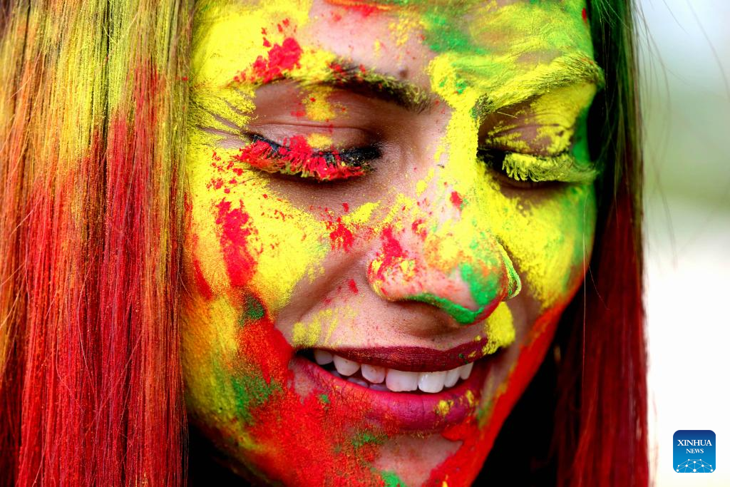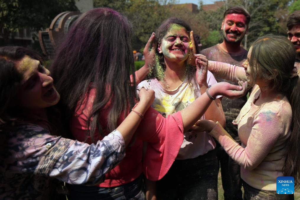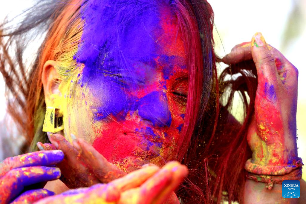 Women smeared with colored powder celebrate Holi festival in Bhopal, India, March 22, 2024. Holi, the festival of colors, marks the beginning of the spring season. (Str/Xinhua)