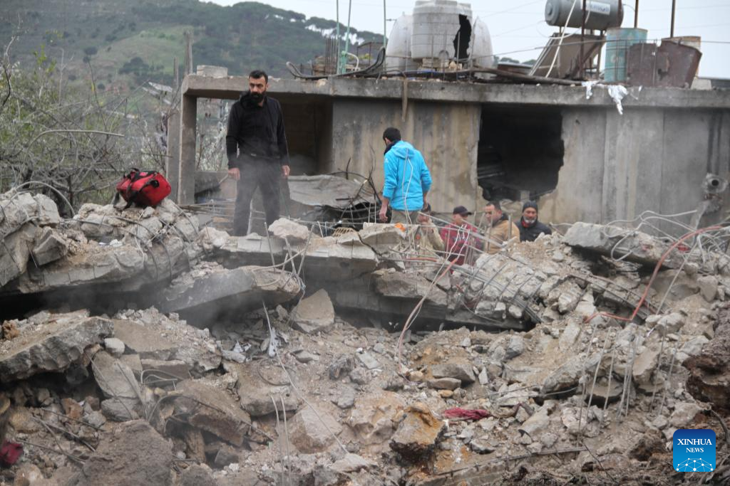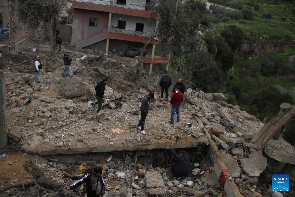 People inspect buildings destroyed by an Israeli strike in Al-Habbariyah, Lebanon, on March 27, 2024. At least seven were killed and more injured on Wednesday in an Israeli strike on an emergency and relief center in south Lebanon, Lebanese military sources told Xinhua. (Photo by Taher Abu Hamdan/Xinhua)
