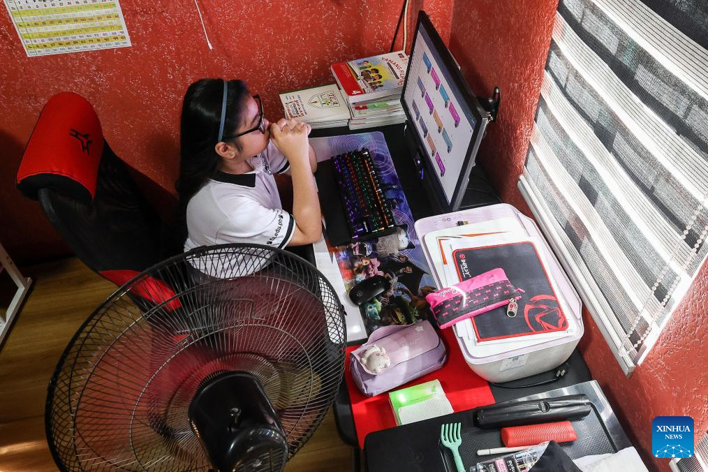 A fourth-grade student attends an online class at her home in Quezon City, the Philippines, April 5, 2024. Sweltering weather has forced 3,954 schools across the Philippines to implement alternative delivery modes of learning to protect the students from the high heat index, the government said Wednesday.