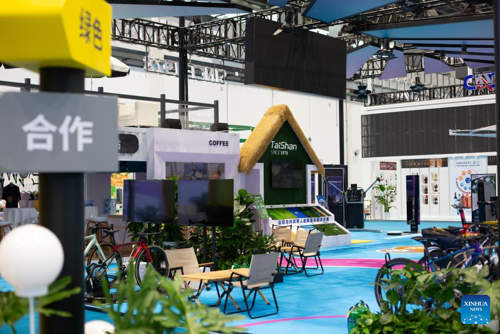 This photo taken on April 12, 2024 shows a view of the exhibition area of food, supplement and beverage at the Hainan International Convention and Exhibition Center, the main venue for the upcoming fourth China International Consumer Products Expo, in Haikou, south China's Hainan Province. The fourth China International Consumer Products Expo will open on Saturday in Haikou, the capital city of south China's Hainan Province.