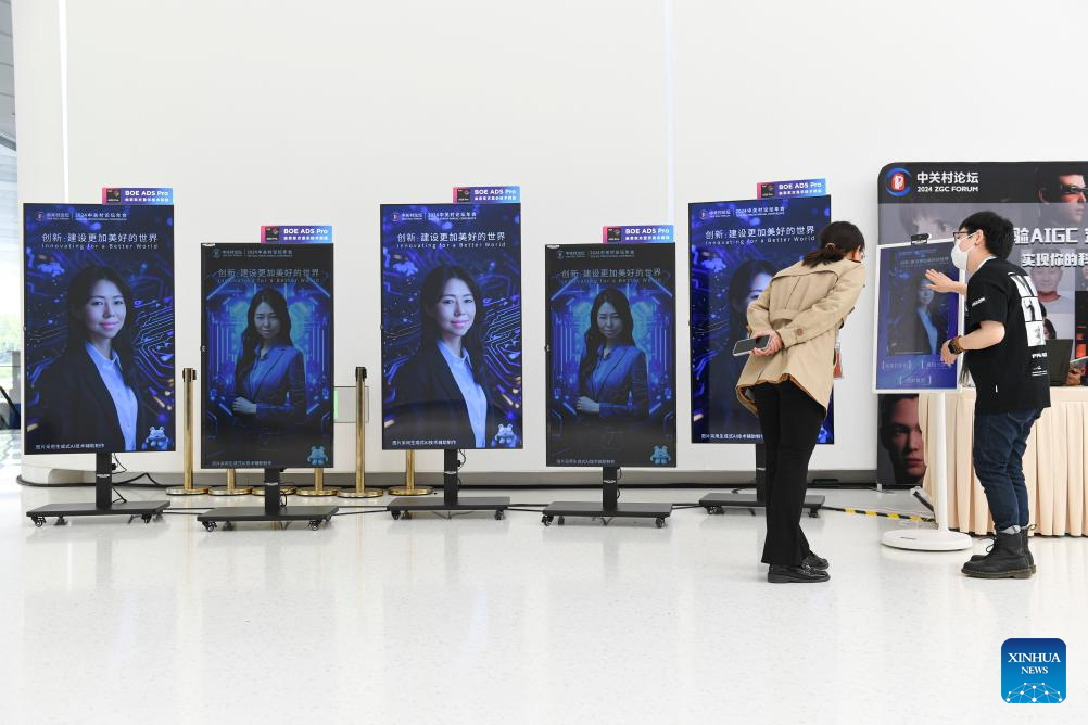A staff member tries an AI project at the Zhongguancun International Innovation Center, new venue for Zhongguancun Forum (ZGC Forum), in Beijing, capital of China, April 24, 2024. Themed "Innovation: Building a Better World," this year's ZGC Forum is to be held at Zhongguancun International Innovation Center for the first time in Beijing from April 25 to 29. (Xinhua/Chen Zhonghao)