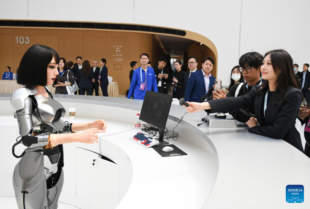 Journalists interact with a bionic humanoid robot at the Zhongguancun International Innovation Center, new venue for Zhongguancun Forum (ZGC Forum), in Beijing, capital of China, April 24, 2024. Themed "Innovation: Building a Better World," this year's ZGC Forum is to be held at Zhongguancun International Innovation Center for the first time in Beijing from April 25 to 29. (Xinhua/Chen Zhonghao)