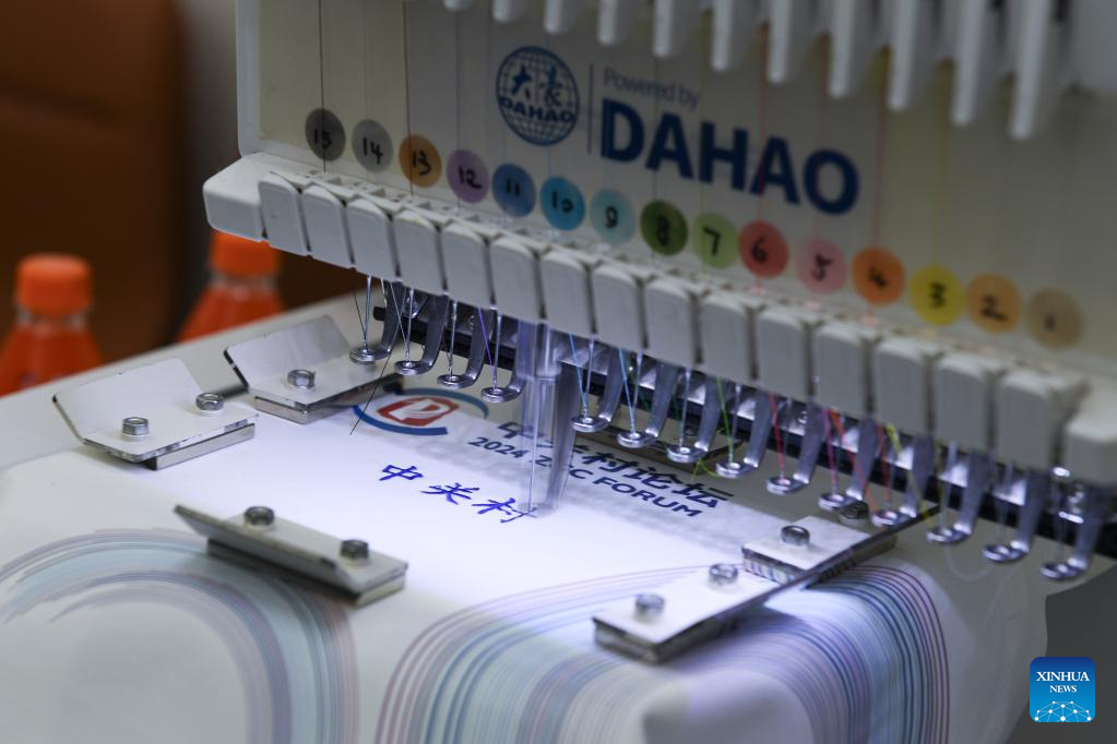 This photo shows an intelligent embroidery machine at the Zhongguancun International Innovation Center, new venue for Zhongguancun Forum (ZGC Forum), in Beijing, capital of China, April 24, 2024. Themed "Innovation: Building a Better World," this year's ZGC Forum is to be held at Zhongguancun International Innovation Center for the first time in Beijing from April 25 to 29. (Xinhua/Chen Zhonghao)