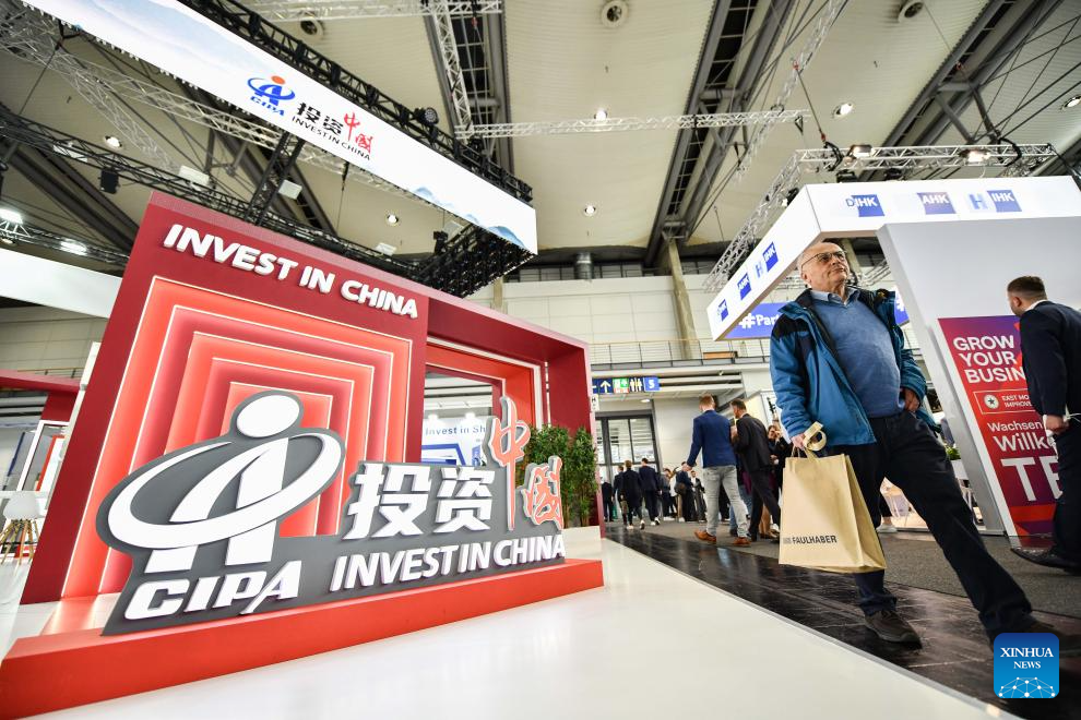 Visitors walk past the booth of Invest in China at Hannover Messe 2024 in Hannover, Germany, April 22, 2024. The exhibition, focused on "energizing a sustainable industry," runs until Friday and attracted almost 4,000 exhibitors from around 60 countries and regions. Among them, Chinese exhibitors accounted for 30 percent of participants, second only to the host Germany, according to the organizer. (Xinhua/Ren Pengfei)