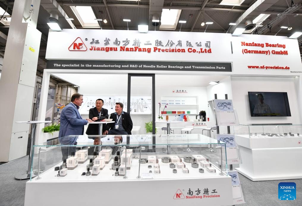 People talk at the booth of Jiangsu Nanfang Precision Co., Ltd. at Hannover Messe 2024 in Hannover, Germany, April 23, 2024. The exhibition, focused on "energizing a sustainable industry," runs until Friday and attracted almost 4,000 exhibitors from around 60 countries and regions. Among them, Chinese exhibitors accounted for 30 percent of participants, second only to the host Germany, according to the organizer. (Xinhua/Ren Pengfei)