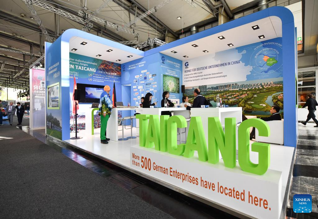 This photo taken on April 22, 2024 shows the booth of Taicang, a city in east China's Jiangsu Province, at Hannover Messe 2024 in Hannover, Germany. The exhibition, focused on "energizing a sustainable industry," runs until Friday and attracted almost 4,000 exhibitors from around 60 countries and regions. Among them, Chinese exhibitors accounted for 30 percent of participants, second only to the host Germany, according to the organizer. (Xinhua/Ren Pengfei)
