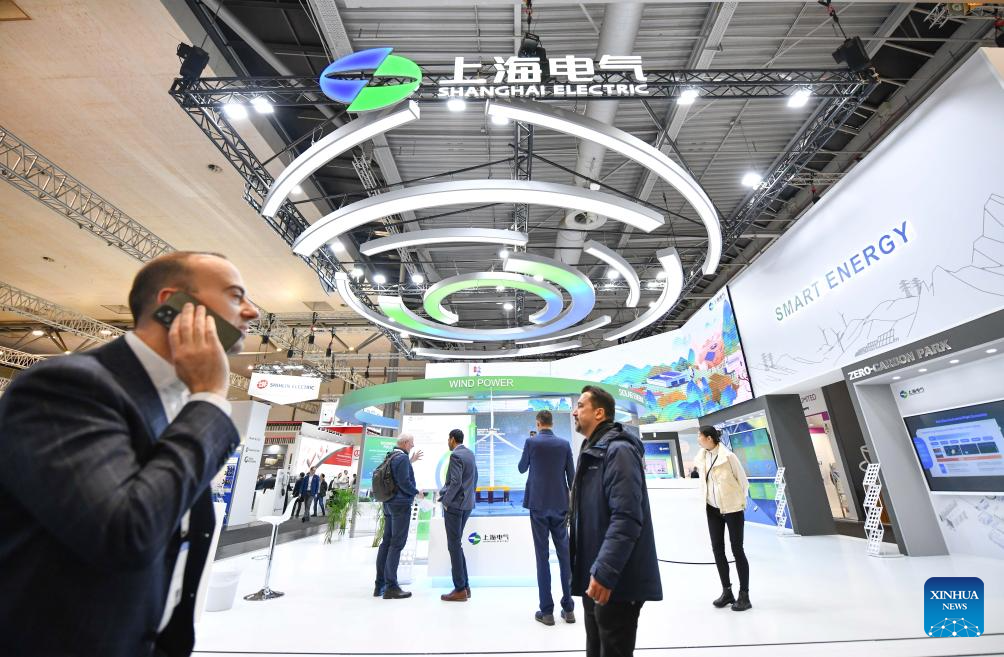 People walk past the booth of Shanghai Electric Group Co., Ltd. at Hannover Messe 2024 in Hannover, Germany, April 23, 2024. The exhibition, focused on "energizing a sustainable industry," runs until Friday and attracted almost 4,000 exhibitors from around 60 countries and regions. Among them, Chinese exhibitors accounted for 30 percent of participants, second only to the host Germany, according to the organizer. (Xinhua/Ren Pengfei)