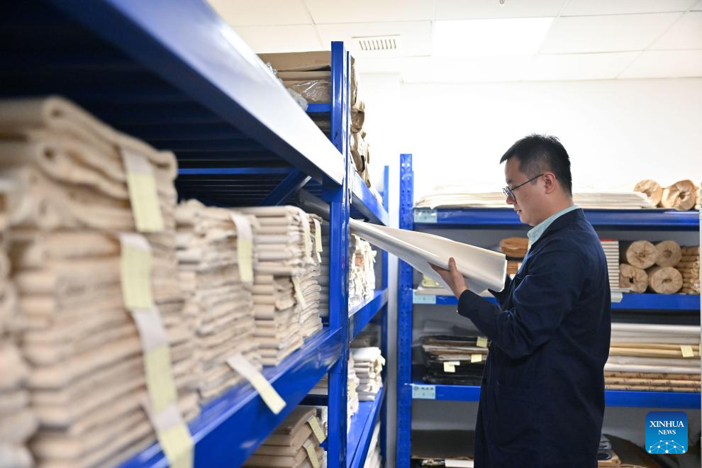 Gao Xuemiao selects paper materials for ancient book restoration at Tianjin Library in north China's Tianjin Municipality, April 22, 2024. Tianjin Library is home to a collection of 590,000 ancient books and has conducted ancient book restoration work for over 70 years.