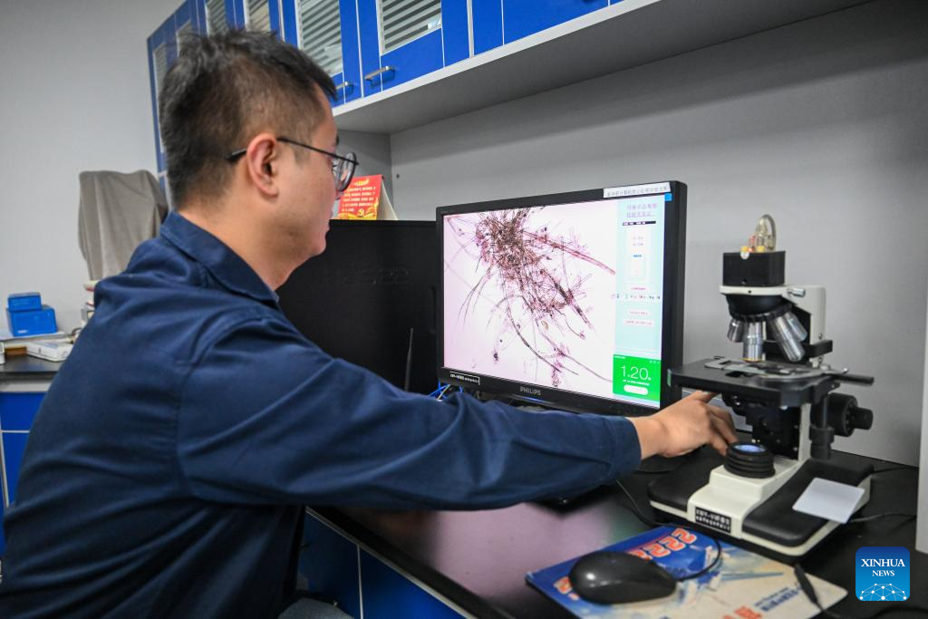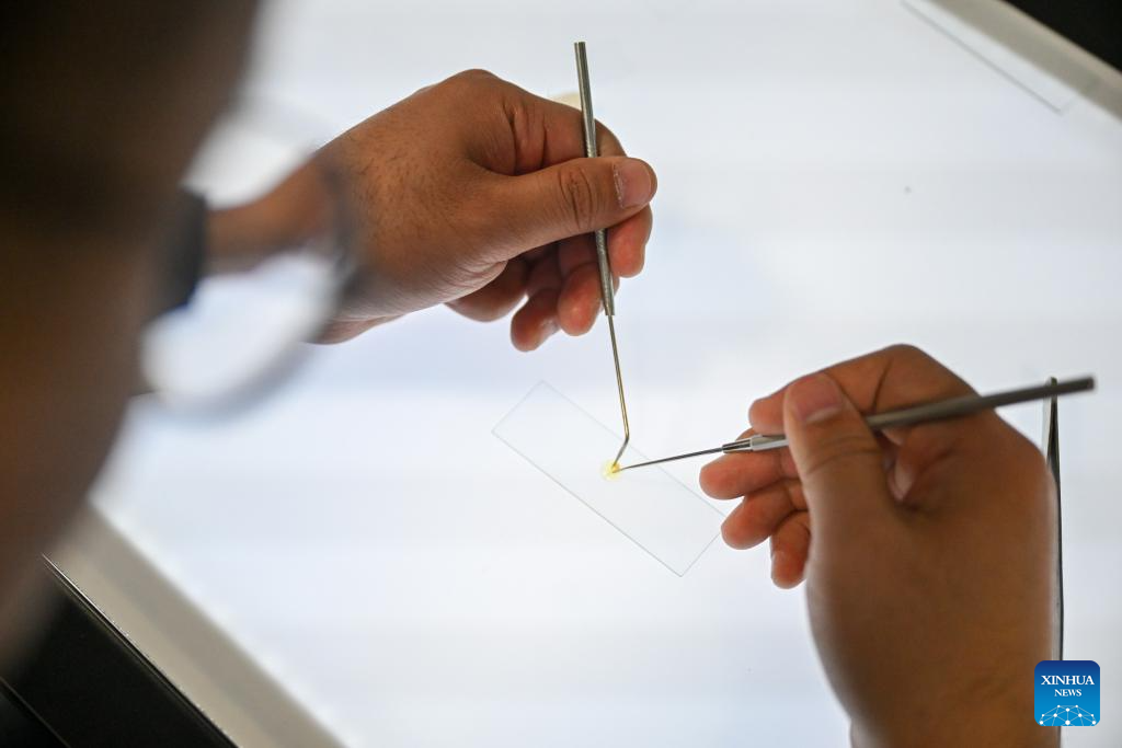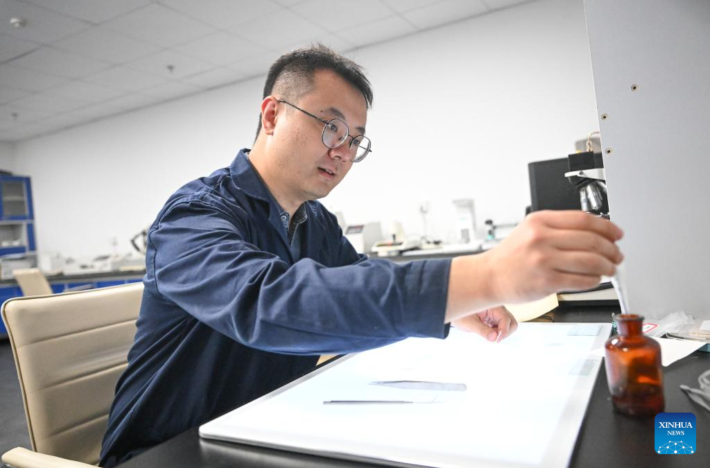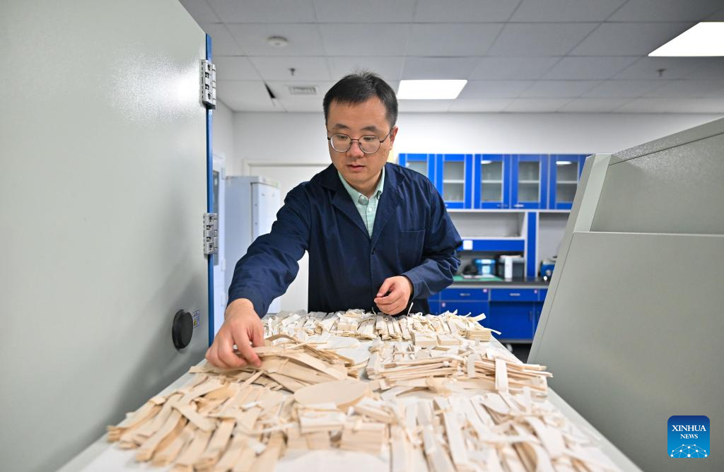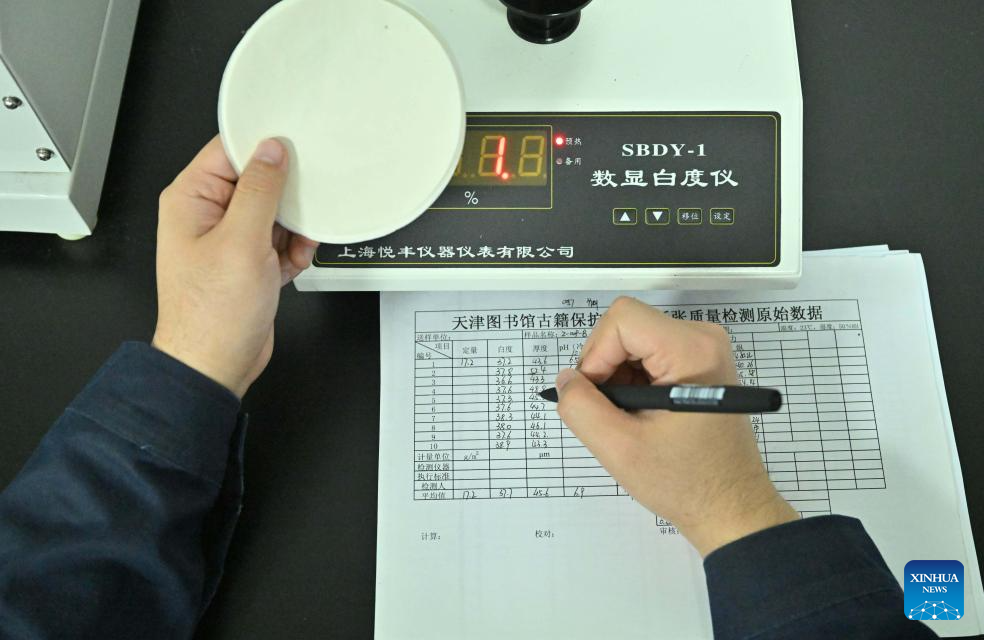 Gao Xuemiao measures the value of paper fibers at the laboratory of Tianjin Library in north China's Tianjin Municipality, April 18, 2024. Tianjin Library is home to a collection of 590,000 ancient books and has conducted ancient book restoration work for over 70 years.