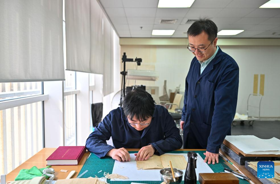 Gao Xuemiao (R) guides an intern to restore an ancient book at Tianjin Library in north China's Tianjin Municipality, April 22, 2024. Tianjin Library is home to a collection of 590,000 ancient books and has conducted ancient book restoration work for over 70 years.