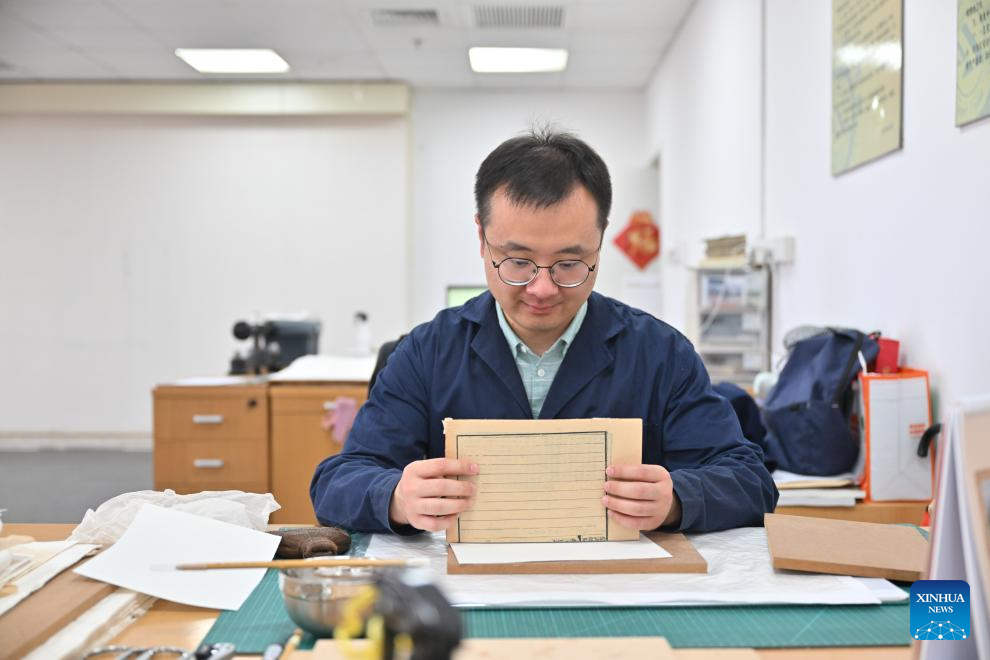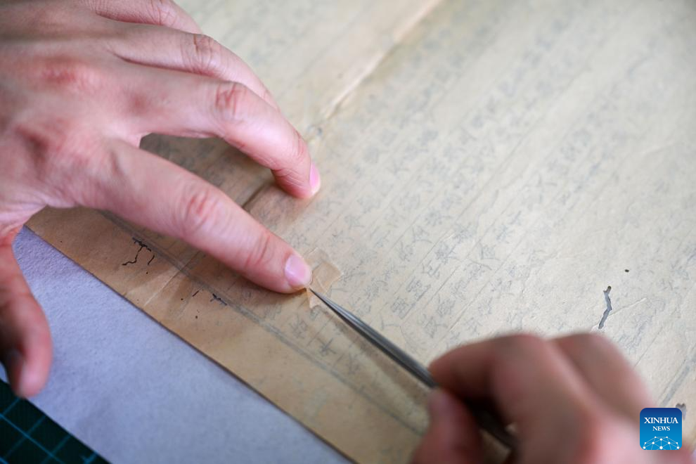 A staff member restores an ancient book at Tianjin Library in north China's Tianjin Municipality, April 22, 2024. Tianjin Library is home to a collection of 590,000 ancient books and has conducted ancient book restoration work for over 70 years.