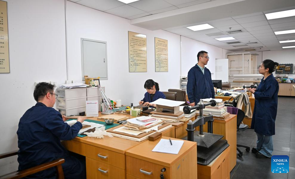 This photo taken on April 22, 2024 shows a view of the ancient book restoration department at Tianjin Library in north China's Tianjin Municipality. Tianjin Library is home to a collection of 590,000 ancient books and has conducted ancient book restoration work for over 70 years.