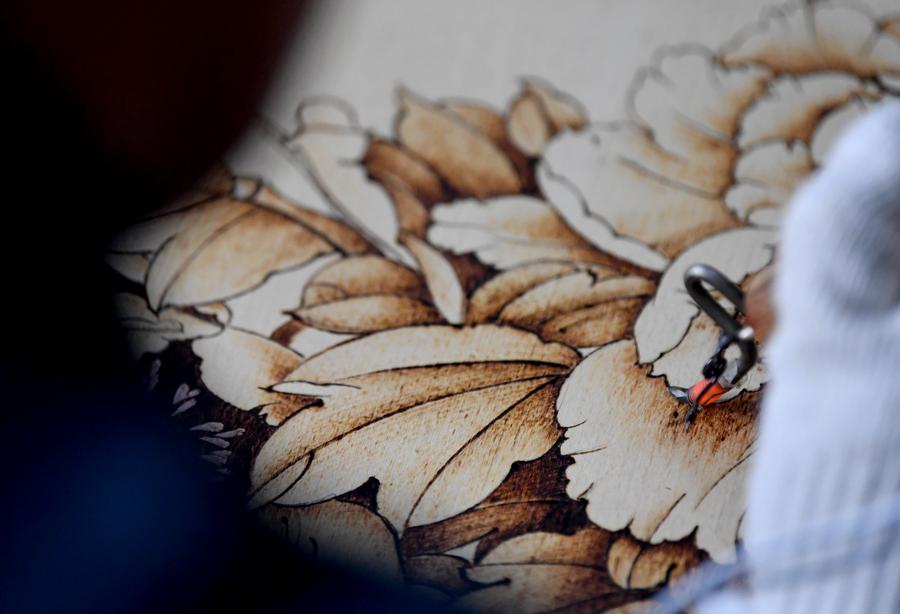 "The key of Nanyang Pyrography lies in artist's control of the temperature, speed and strength when using the electric soldering iron," Li said, "pyrography's themes cover characters, mountains and rivers, flowers and birds, which are inspired from traditional Chinese paintings."