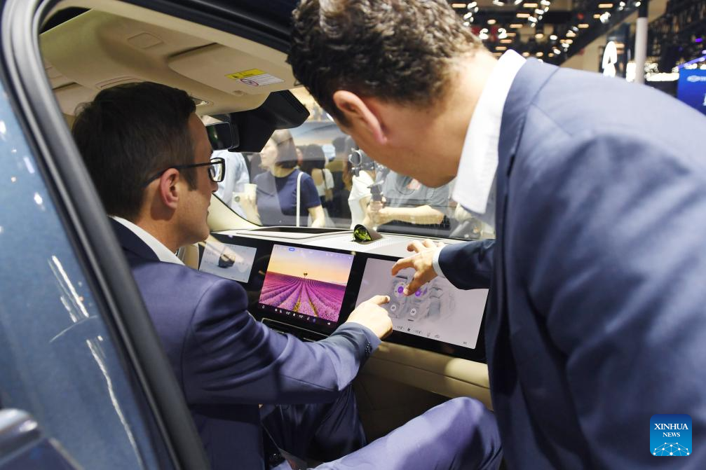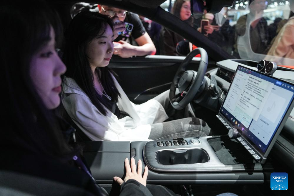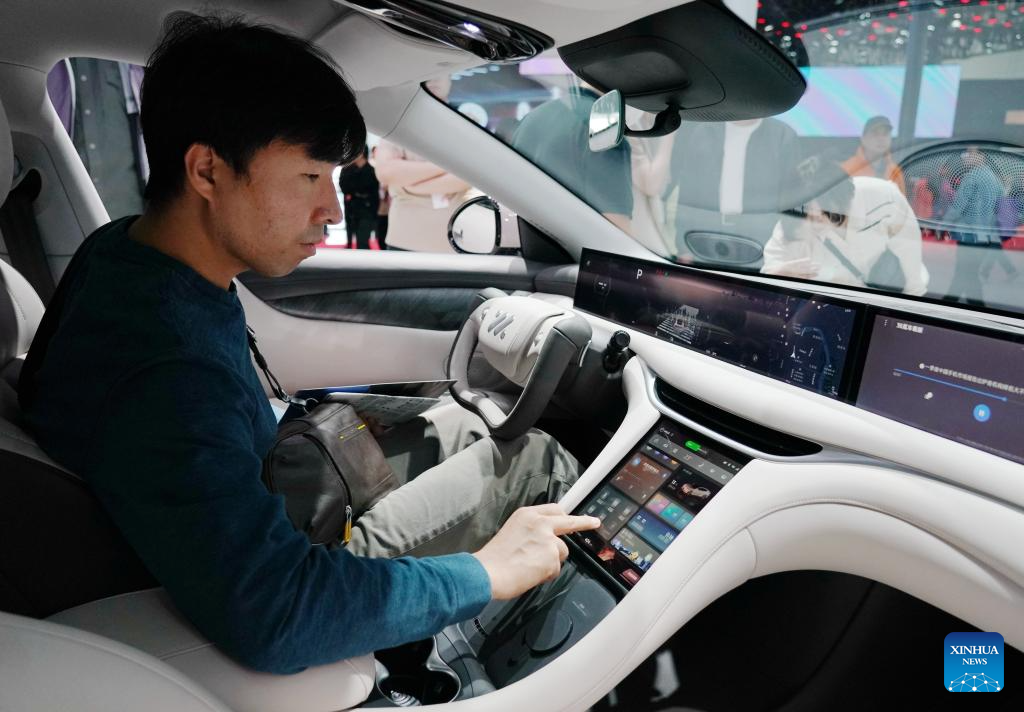 A visitor experiences IM Motors' new energy vehicle model at the 2024 Beijing International Automotive Exhibition in Beijing, China, April 30, 2024. The 2024 Beijing International Automotive Exhibition, an A-list event continuing through May 4, is showcasing an unprecedented number of new energy vehicles (NEVs), with 278 distinct NEV models on display, reflecting the growing dominance of NEVs in the auto industry. The cutting-edge technologies, customer-friendly novelties and affordability have wowed visitors at the show and underlined how the Chinese NEV sector has succeeded in zooming ahead over the past decade.