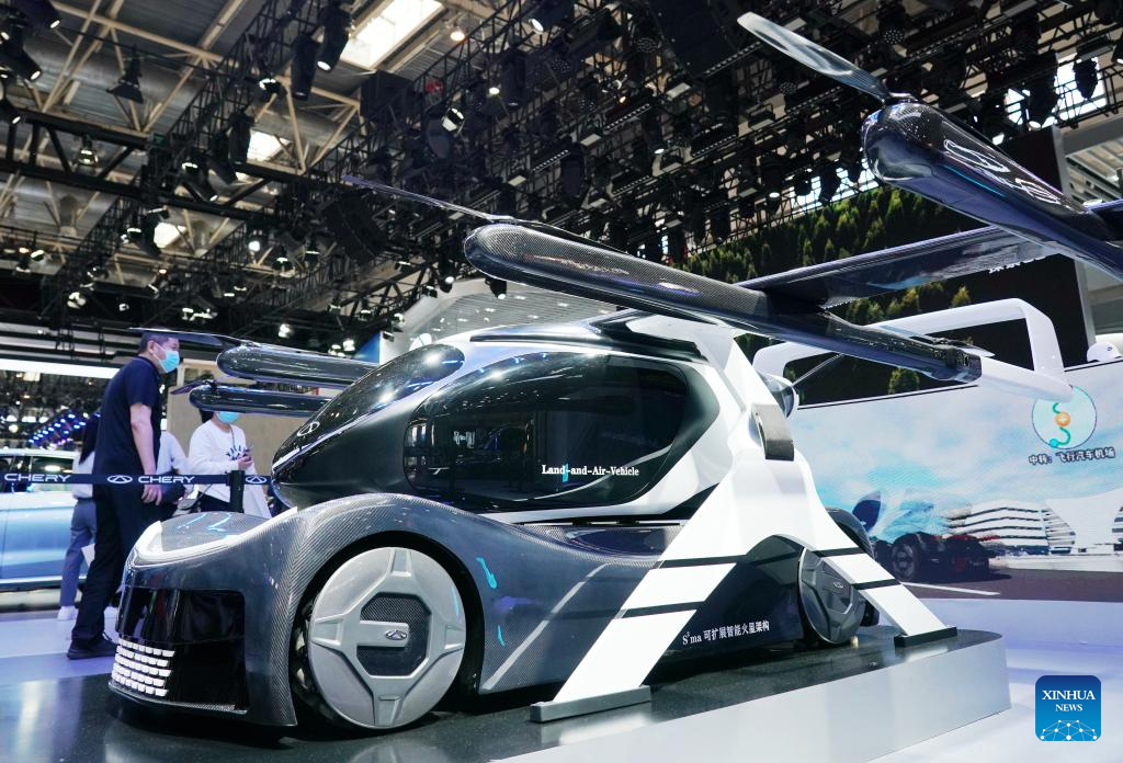 Visitors watch a land-and-air vehicle displayed at the 2024 Beijing International Automotive Exhibition in Beijing, China, April 30, 2024. The 2024 Beijing International Automotive Exhibition, an A-list event continuing through May 4, is showcasing an unprecedented number of new energy vehicles (NEVs), with 278 distinct NEV models on display, reflecting the growing dominance of NEVs in the auto industry. The cutting-edge technologies, customer-friendly novelties and affordability have wowed visitors at the show and underlined how the Chinese NEV sector has succeeded in zooming ahead over the past decade.