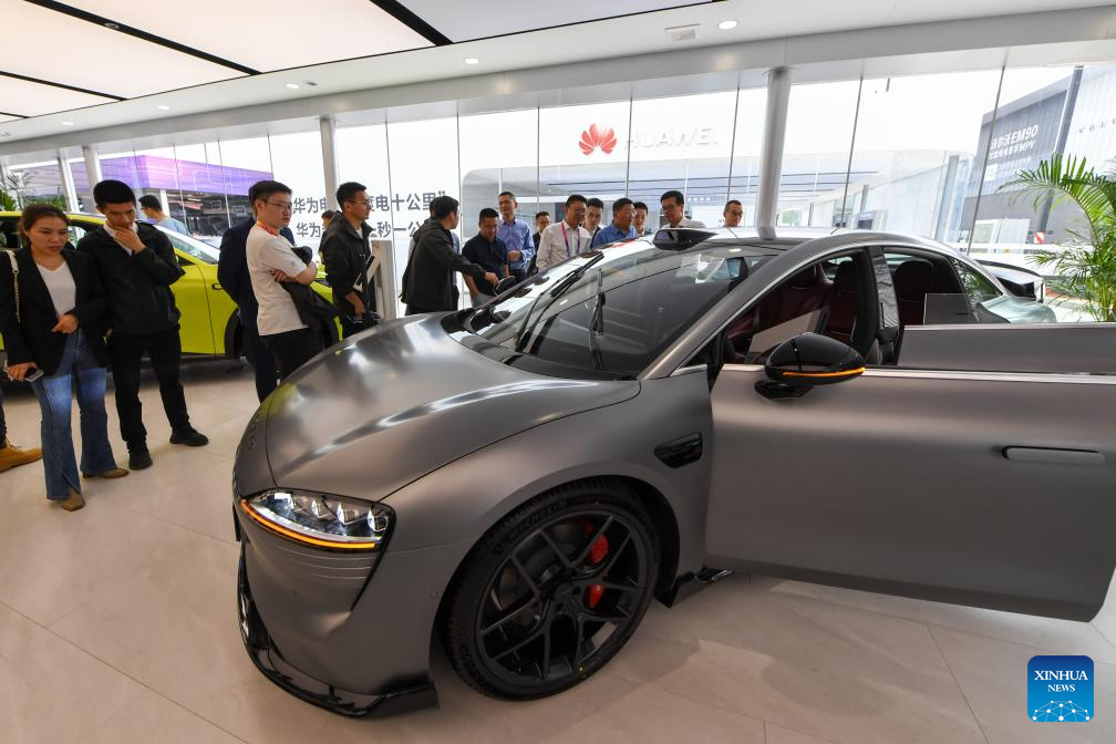 Visitors watch a new energy vehicle equipped with Huawei's Qiankun system at the 2024 Beijing International Automotive Exhibition in Beijing, China, April 25, 2024. The 2024 Beijing International Automotive Exhibition, an A-list event continuing through May 4, is showcasing an unprecedented number of new energy vehicles (NEVs), with 278 distinct NEV models on display, reflecting the growing dominance of NEVs in the auto industry. The cutting-edge technologies, customer-friendly novelties and affordability have wowed visitors at the show and underlined how the Chinese NEV sector has succeeded in zooming ahead over the past decade.