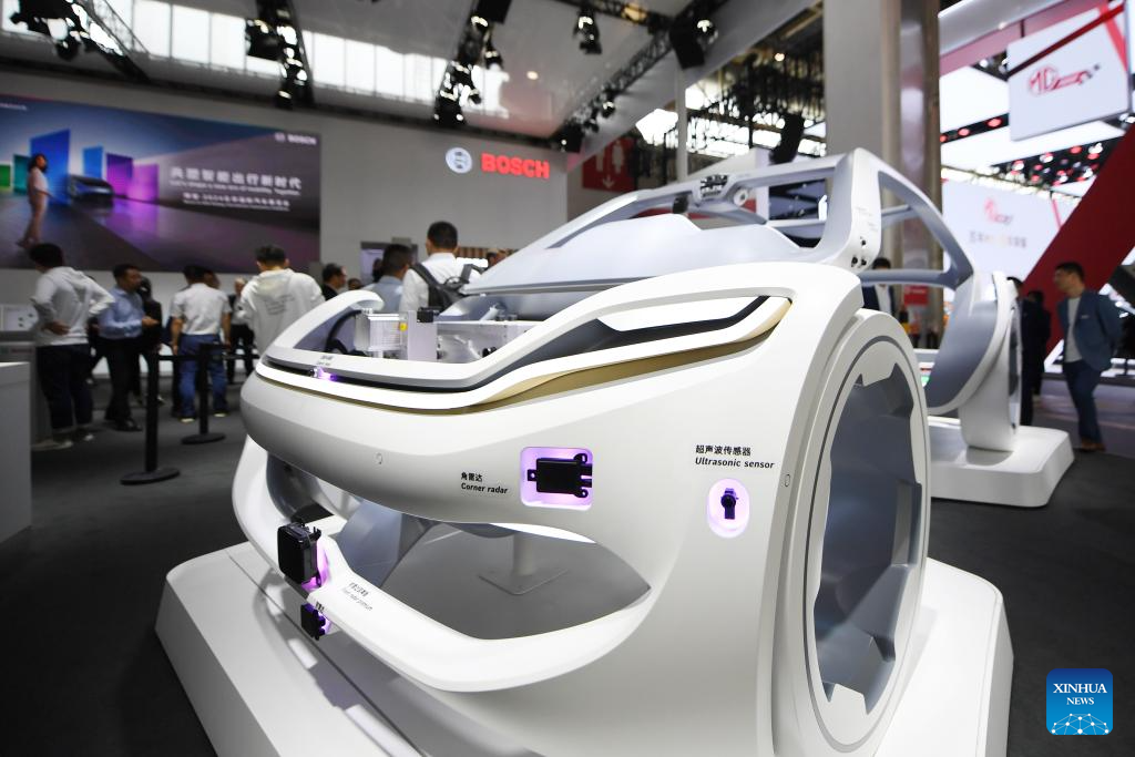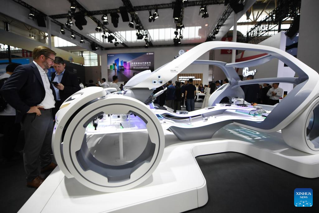 Products related to Bosch's intelligent transportation system are displayed at the 2024 Beijing International Automotive Exhibition in Beijing, China, April 25, 2024. The 2024 Beijing International Automotive Exhibition, an A-list event continuing through May 4, is showcasing an unprecedented number of new energy vehicles (NEVs), with 278 distinct NEV models on display, reflecting the growing dominance of NEVs in the auto industry. The cutting-edge technologies, customer-friendly novelties and affordability have wowed visitors at the show and underlined how the Chinese NEV sector has succeeded in zooming ahead over the past decade.