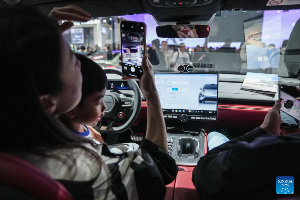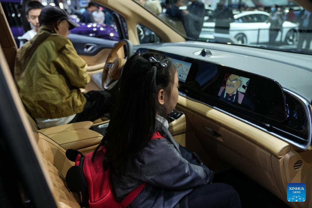 A child watches cartoon in a new energy vehicle at the 2024 Beijing International Automotive Exhibition in Beijing, China, April 28, 2024. The 2024 Beijing International Automotive Exhibition, an A-list event continuing through May 4, is showcasing an unprecedented number of new energy vehicles (NEVs), with 278 distinct NEV models on display, reflecting the growing dominance of NEVs in the auto industry. The cutting-edge technologies, customer-friendly novelties and affordability have wowed visitors at the show and underlined how the Chinese NEV sector has succeeded in zooming ahead over the past decade.