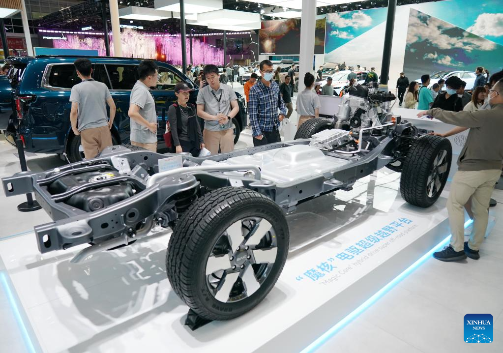 Visitors watch the "Magic Core" hybrid drive super off-road platform of BAIC at the 2024 Beijing International Automotive Exhibition in Beijing, China, April 30, 2024. The 2024 Beijing International Automotive Exhibition, an A-list event continuing through May 4, is showcasing an unprecedented number of new energy vehicles (NEVs), with 278 distinct NEV models on display, reflecting the growing dominance of NEVs in the auto industry. The cutting-edge technologies, customer-friendly novelties and affordability have wowed visitors at the show and underlined how the Chinese NEV sector has succeeded in zooming ahead over the past decade.