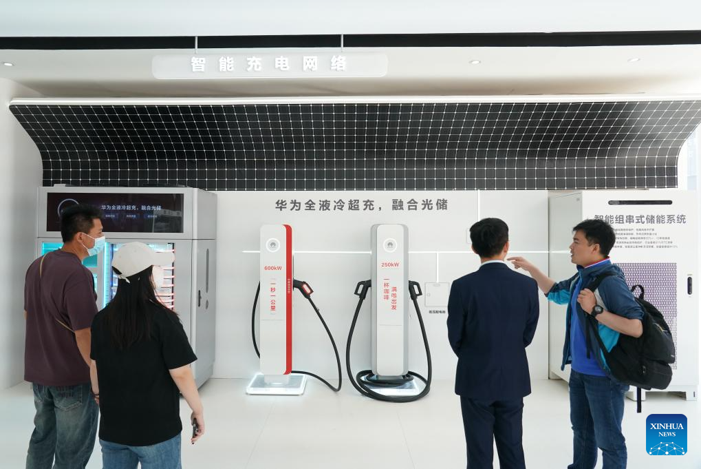 Visitors watch a display on Huawei's smart charging network at the 2024 Beijing International Automotive Exhibition in Beijing, China, April 30, 2024. The 2024 Beijing International Automotive Exhibition, an A-list event continuing through May 4, is showcasing an unprecedented number of new energy vehicles (NEVs), with 278 distinct NEV models on display, reflecting the growing dominance of NEVs in the auto industry. The cutting-edge technologies, customer-friendly novelties and affordability have wowed visitors at the show and underlined how the Chinese NEV sector has succeeded in zooming ahead over the past decade.