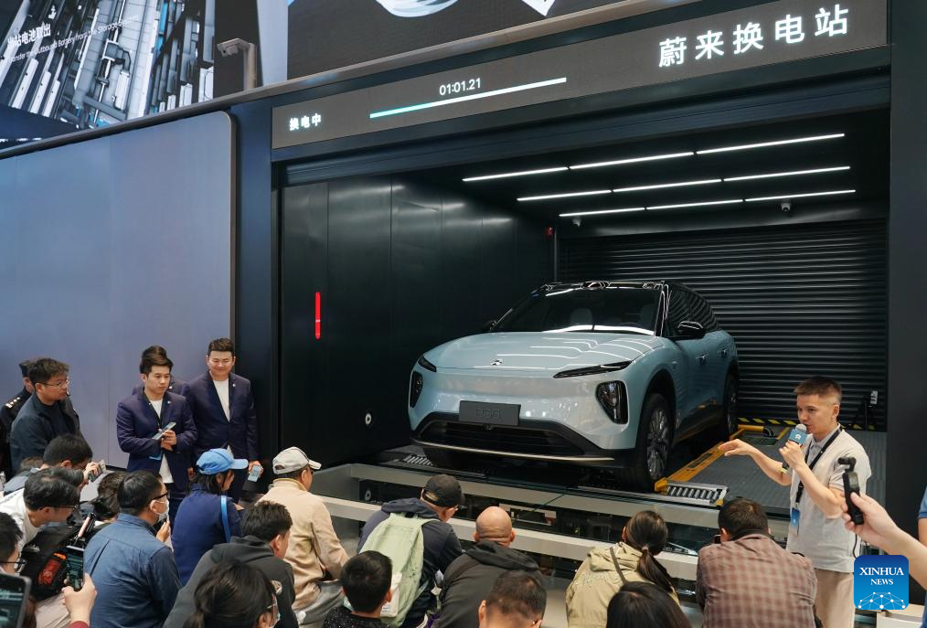 Visitors watch the demonstration of a battery swap station of Chinese brand NIO at the 2024 Beijing International Automotive Exhibition in Beijing, China, April 25, 2024. The 2024 Beijing International Automotive Exhibition, an A-list event continuing through May 4, is showcasing an unprecedented number of new energy vehicles (NEVs), with 278 distinct NEV models on display, reflecting the growing dominance of NEVs in the auto industry. The cutting-edge technologies, customer-friendly novelties and affordability have wowed visitors at the show and underlined how the Chinese NEV sector has succeeded in zooming ahead over the past decade.