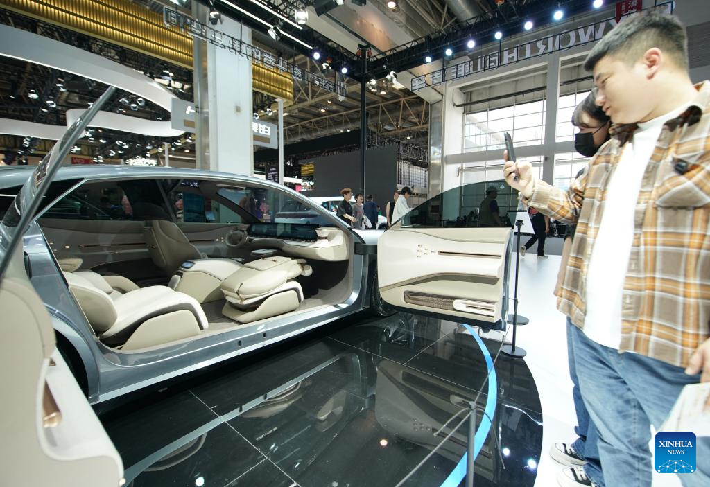 People watch a vehicle at the booth of Skyworth Auto at the 2024 Beijing International Automotive Exhibition in Beijing, China, April 30, 2024. The 2024 Beijing International Automotive Exhibition, an A-list event continuing through May 4, is showcasing an unprecedented number of new energy vehicles (NEVs), with 278 distinct NEV models on display, reflecting the growing dominance of NEVs in the auto industry. The cutting-edge technologies, customer-friendly novelties and affordability have wowed visitors at the show and underlined how the Chinese NEV sector has succeeded in zooming ahead over the past decade.