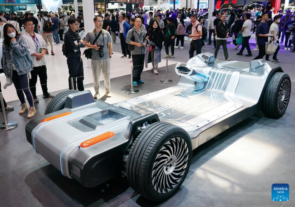 People watch products related to Bosch's intelligent transportation system at the 2024 Beijing International Automotive Exhibition in Beijing, China, April 25, 2024. The 2024 Beijing International Automotive Exhibition, an A-list event continuing through May 4, is showcasing an unprecedented number of new energy vehicles (NEVs), with 278 distinct NEV models on display, reflecting the growing dominance of NEVs in the auto industry. The cutting-edge technologies, customer-friendly novelties and affordability have wowed visitors at the show and underlined how the Chinese NEV sector has succeeded in zooming ahead over the past decade.