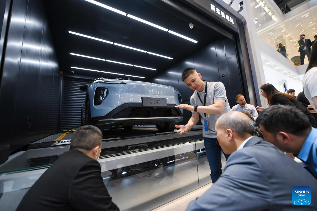 Visitors watch the demonstration of a battery swap station of Chinese brand NIO at the 2024 Beijing International Automotive Exhibition in Beijing, China, April 30, 2024. The 2024 Beijing International Automotive Exhibition, an A-list event continuing through May 4, is showcasing an unprecedented number of new energy vehicles (NEVs), with 278 distinct NEV models on display, reflecting the growing dominance of NEVs in the auto industry. The cutting-edge technologies, customer-friendly novelties and affordability have wowed visitors at the show and underlined how the Chinese NEV sector has succeeded in zooming ahead over the past decade.