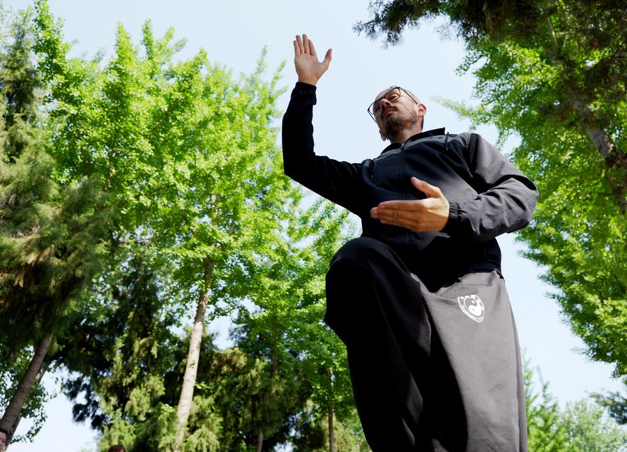 (240508) -- ZHENGZHOU, May 8, 2024 (Xinhua) --Guillaume Large (Chen Shaoquan), a 44-year-old Taichi enthusiast from Bordeaux of France, has been practicing Taichi for over 20 years. Guillaume Large got a sports injury in his young age and decided to start practicing Taichi at a local club in France as a way of recovery. From then on he gradually fell in love with Taichi. In 2007, Guillaume Large and his fellows established an association, aiming to promote Chinese culture in France through teaching Taichi and Chinese, etc.