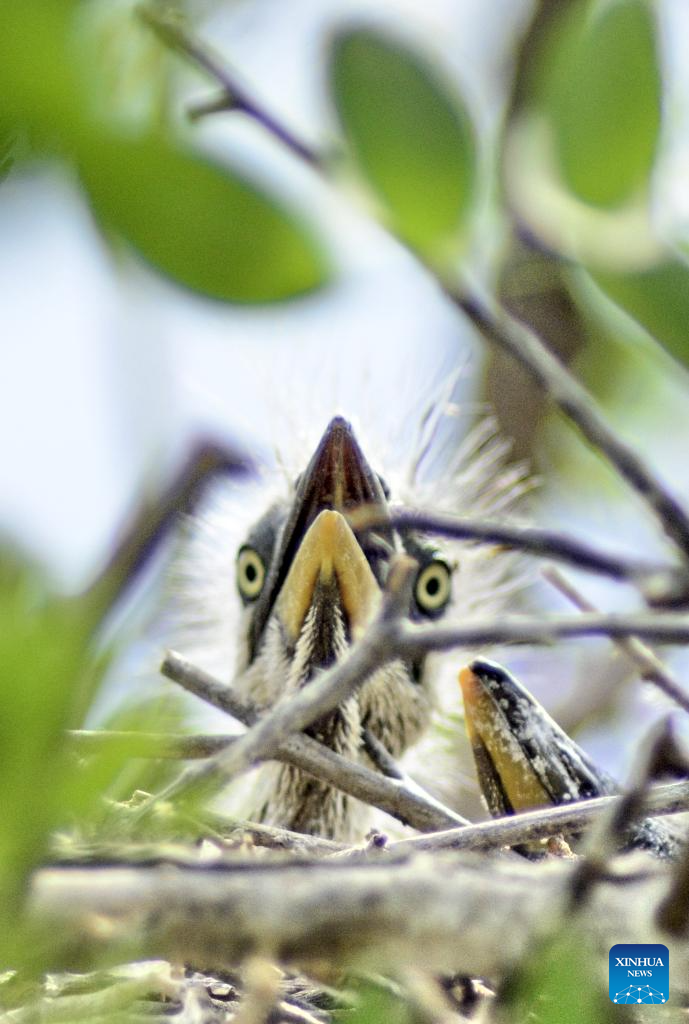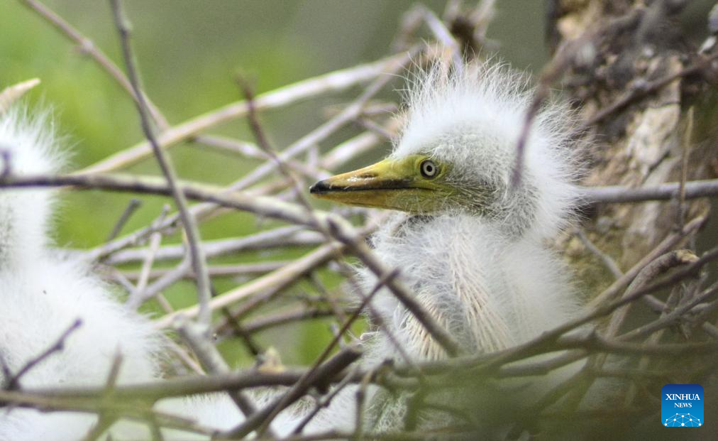 A baby egret is seen at Miyun reservoir in Beijing, capital of China, May 14, 2024. Over 3,000 of six species of birds are currently breeding baby birds on an island at Miyun reservoir. A good habitat for birds was created here thanks to the measures taken by local authorities in recent years. (Xinhua/Li Xin)