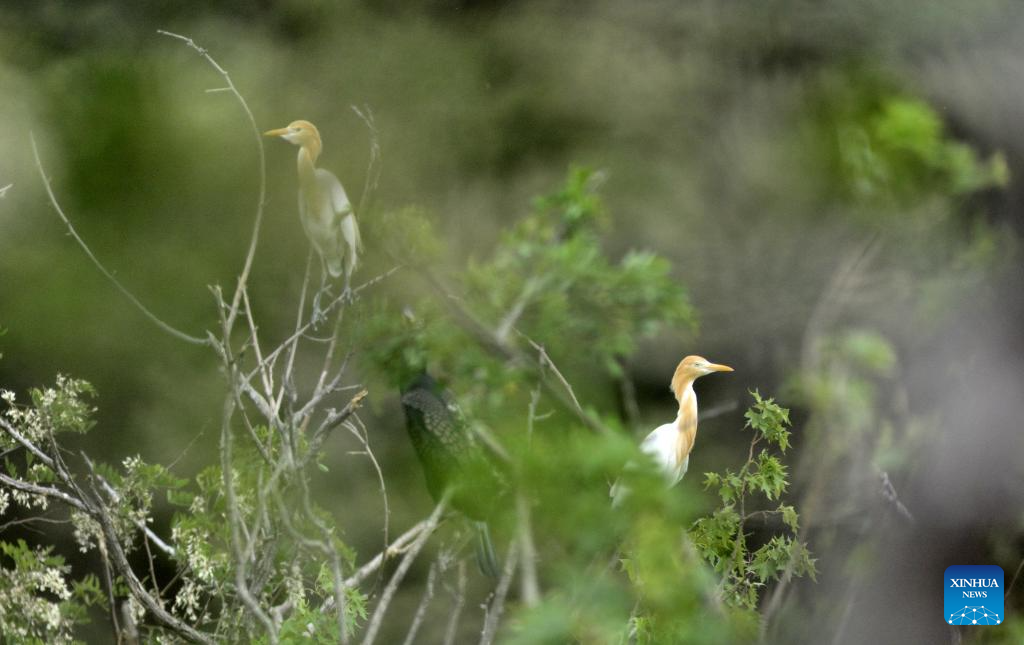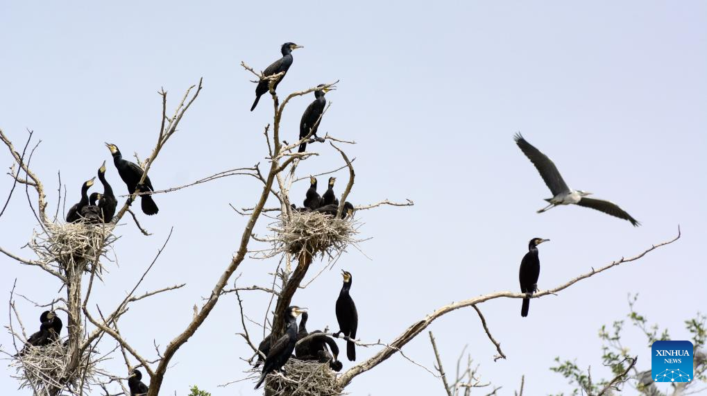 Birds perch on a tree at Miyun reservoir in Beijing, capital of China, May 14, 2024. Over 3,000 of six species of birds are currently breeding baby birds on an island at Miyun reservoir. A good habitat for birds was created here thanks to the measures taken by local authorities in recent years. (Xinhua/Li Xin)