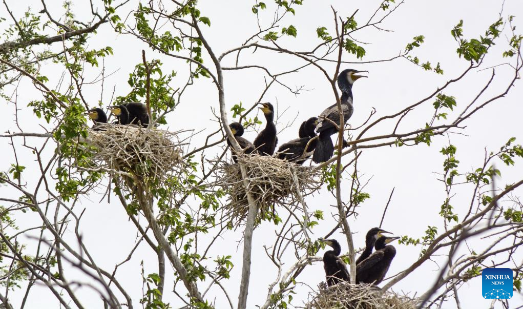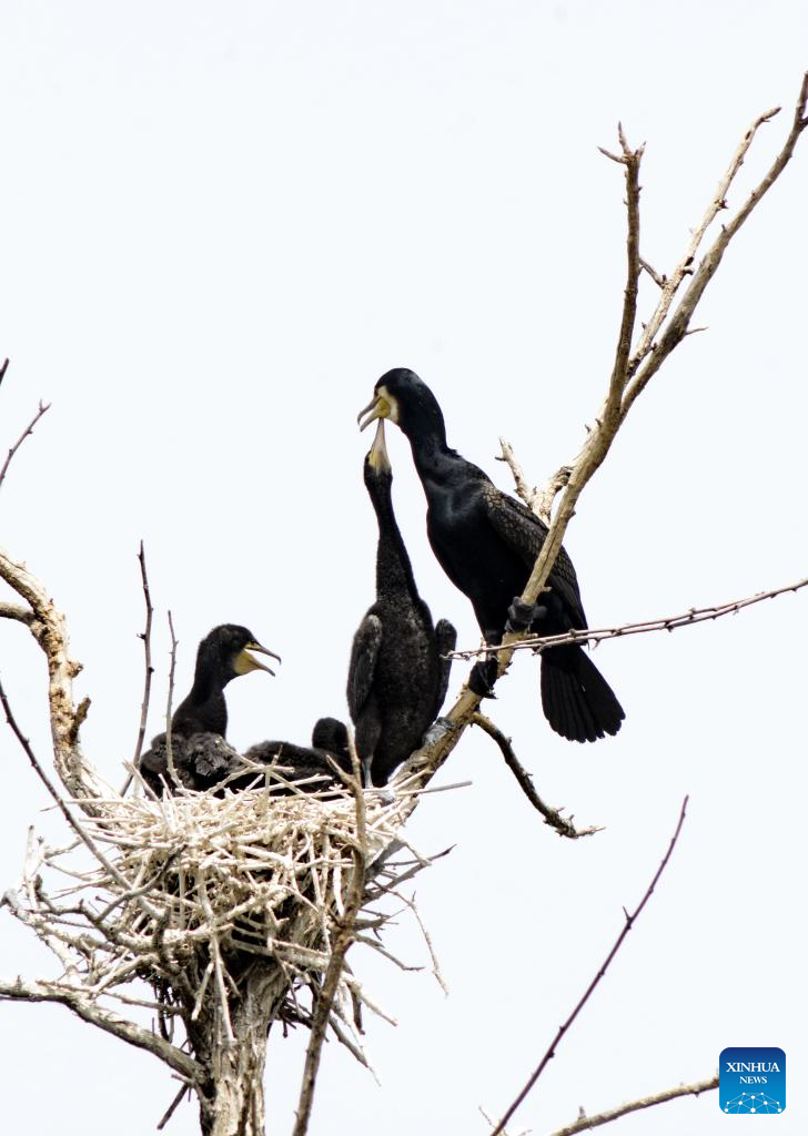 Baby cormorants are seen at Miyun reservoir in Beijing, capital of China, May 14, 2024. Over 3,000 of six species of birds are currently breeding baby birds on an island at Miyun reservoir. A good habitat for birds was created here thanks to the measures taken by local authorities in recent years. (Xinhua/Li Xin)