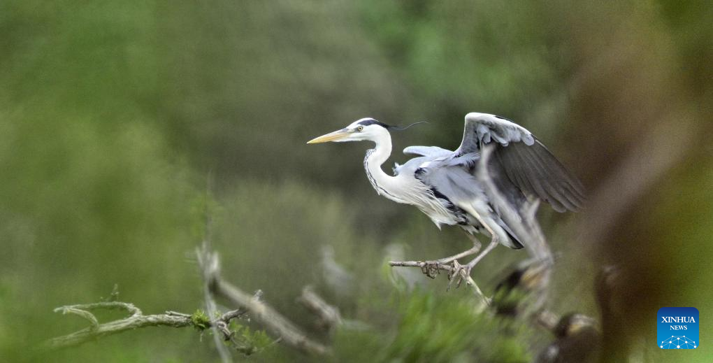 A heron is seen at Miyun reservoir in Beijing, capital of China, May 14, 2024. Over 3,000 of six species of birds are currently breeding baby birds on an island at Miyun reservoir. A good habitat for birds was created here thanks to the measures taken by local authorities in recent years. (Xinhua/Li Xin)