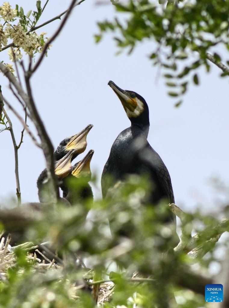 A cormorant feeds its babies at Miyun reservoir in Beijing, capital of China, May 14, 2024. Over 3,000 of six species of birds are currently breeding baby birds on an island at Miyun reservoir. A good habitat for birds was created here thanks to the measures taken by local authorities in recent years. (Xinhua/Li Xin)