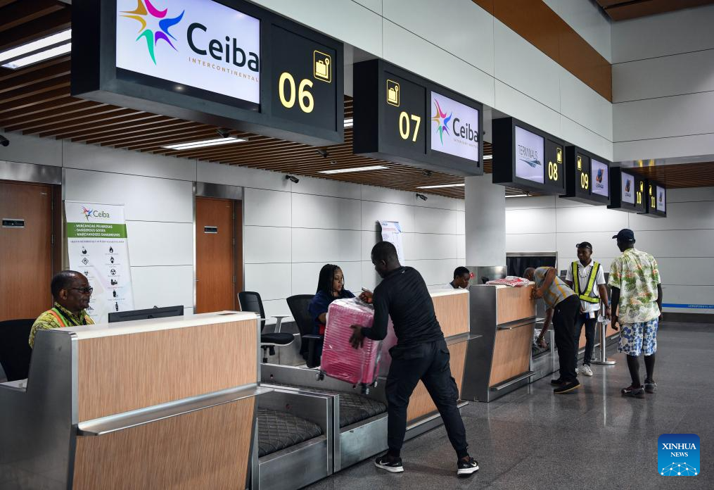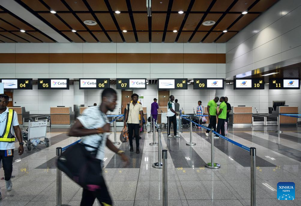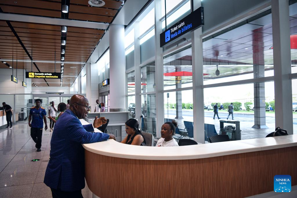 People check in at Malabo International Airport in Equatorial Guinea, on May 15, 2024. The new terminal project of Malabo International Airport, constructed by Weihai International Economic & Technical Cooperative Co., Ltd., turned operational in March 2023. Designed and built entirely according to Chinese standards, the project has a total construction area of approximately 45,000 square meters, capable of take-off and landing services for various types of civil aviation aircraft worldwide. (Xinhua/Han Xu)