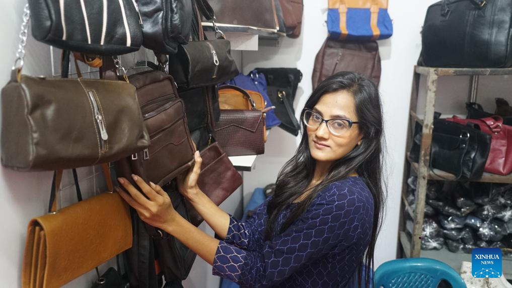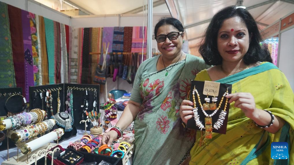Women show products at a stall during Bangladesh's annual National Small and Medium Enterprise (SME) Fair-2024 in Dhaka, Bangladesh, May 19, 2024. Bangladesh's annual National SME Fair-2024 began in the capital of Dhaka on Sunday. More than 300 SME institutions have been exhibiting their products, including jute, agriculture and leather products, and electrical and information and technology goods at the seven-day fair. (Xinhua)