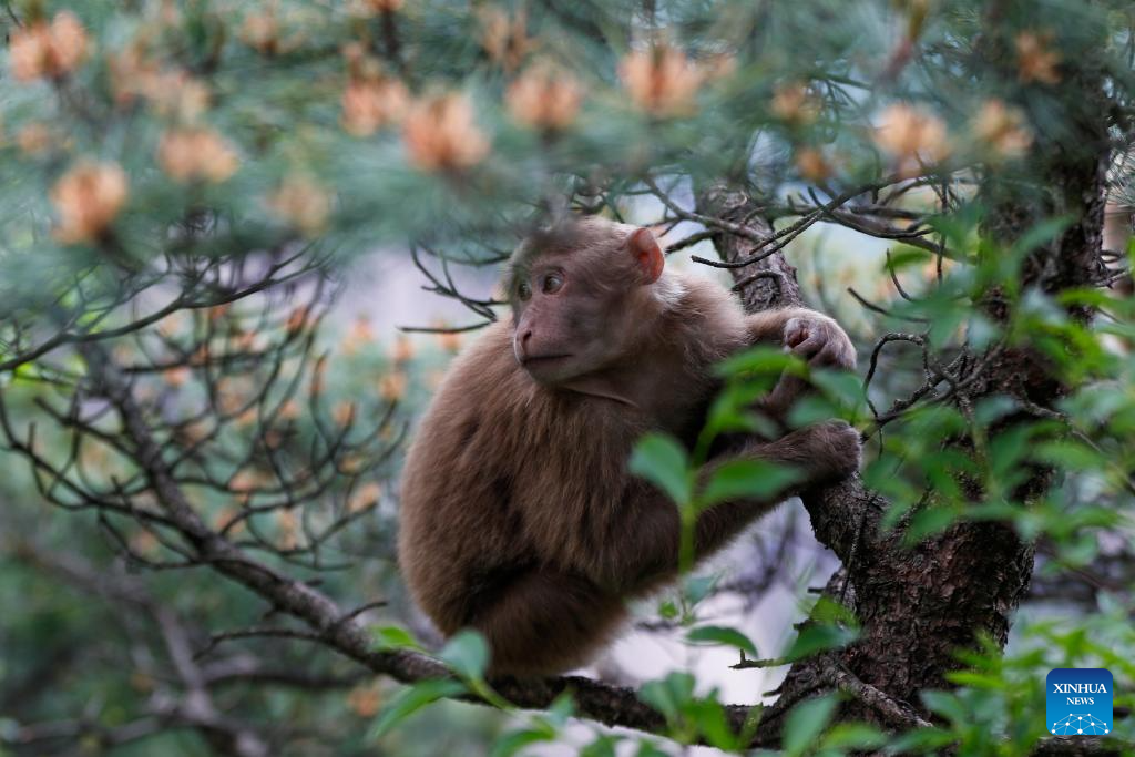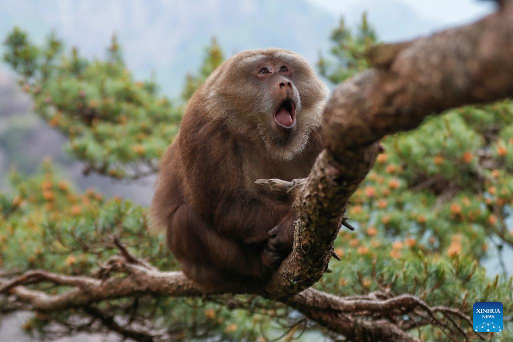 A Huangshan stump-tailed macaque is seen on Huangshan mountain, east China's Anhui Province on May 20, 2024. Huangshan Stump-tailed Macaque (Macaca thibetana huangshanensis), a species unique to Huangshan area of China, often showing up in groups in dense forests and canyons, climbing branches and cliffs with ease, is under China's second-class national protection. (Xinhua/Shi Yalei)