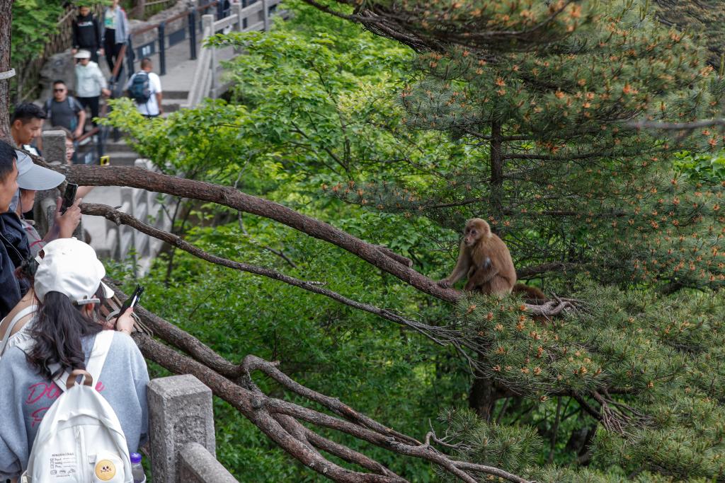 Tourists look at a Huangshan stump-tailed macaque on Huangshan mountain, east China's Anhui Province on May 20, 2024. Huangshan Stump-tailed Macaque (Macaca thibetana huangshanensis), a species unique to Huangshan area of China, often showing up in groups in dense forests and canyons, climbing branches and cliffs with ease, is under China's second-class national protection. (Xinhua/Shi Yalei)